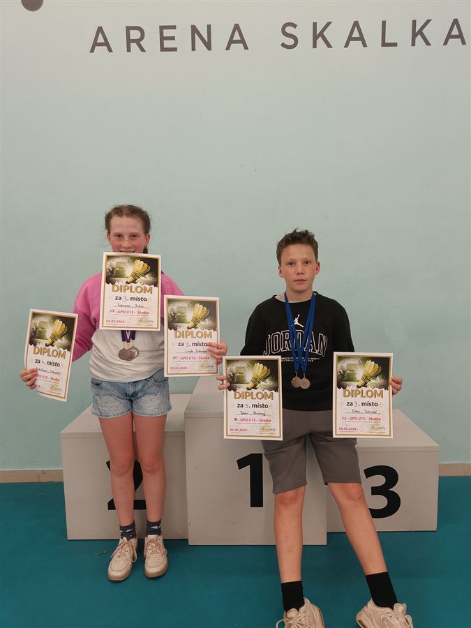 I do mosteckého SportCentra na GP D mladších žáků U-13 jsme vyslali dva velvyslance našeho oddílu, jmenovitě Máru Adolpha s Lukášem Loskotem. V úvodním mixu se ani jednomu z kluků připsat výhru nepodařilo, Mára si zahrál s teplickou Natálií Žižkovou, Luky s klatovskou Eliškou Charouzovou. Ve dvouhře však kluci vybojovali další víkendovou bronzovou medaili, když se to na stupně vítězů podařilo dotáhnout Lukymu. Škoda obou zápasů Máry, i přesto že sbírá své první turnajové zkušenosti, bojoval jako lev a byl svým protihráčům rovnocenným soupeřem, když především utkání o pořadí proti domácímu Danielu Novému bylo velmi dramatické – 21:16, 20:22 a 17:21 nakonec bohužel v neprospěch Máry – i tak palec nahoru za parádní výkon, chyběl kousek! Ve společné čtyřhře pak kluci do prvního kola schytali pozdější vítěze Jiřího Černého s Petrem Křesťanem z Prahy, kterým nedokázali více vzdorovat a ve dvou setech prohráli.