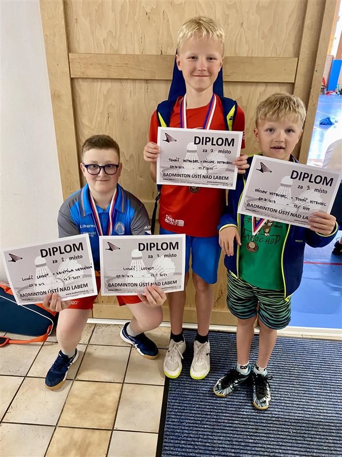 Výprava “B” čítala sedm statečných (s dámským elementem pouze v podobě trenérky Terky) a v pěkné a prostorné devítikurtové ústecké hale na ně čekalo GPC starších žáků U-15 a GP D mladších žáků. Prvního turnaje se v našich barvách zúčastnil pouze Adam Tokar a jako na potvoru to vyšlo tak, že zbyl jako volný jak do mixa, tak do debla, takže nakonec bojoval pouze ve dvouhře, výhru se mu však proti těžkým soupeřům připsat nepodařilo. To čtveřice mladších Mára Adolph, Luky Loskot a bráchové Tomík a Vašík Votrubcovi na GP D U-13 zažila mnoho dalších nových herních situací, zahrála si spoustu třísetových zápasů, z nichž nakonec rezultovalo i několik cenných kovů. Tu nejzářivější se povedlo získat Lukymu s mosteckou Kristýnou Nedvědovou za 2. místo v mixu, bronz pak vybojoval Luky ve dvouhře a Tomík s Vašíkem v bratrské spolupráci ve čtyřhře. I přesto, že Márovi medaile tentokrát necinkla, rozhodně nemusí smutnit, právě naopak! Odehrál totiž krásné zápasy a stejně jako všechny ostatní je třeba ho za předvedené výkony pochválit, jen tak dál kluci!