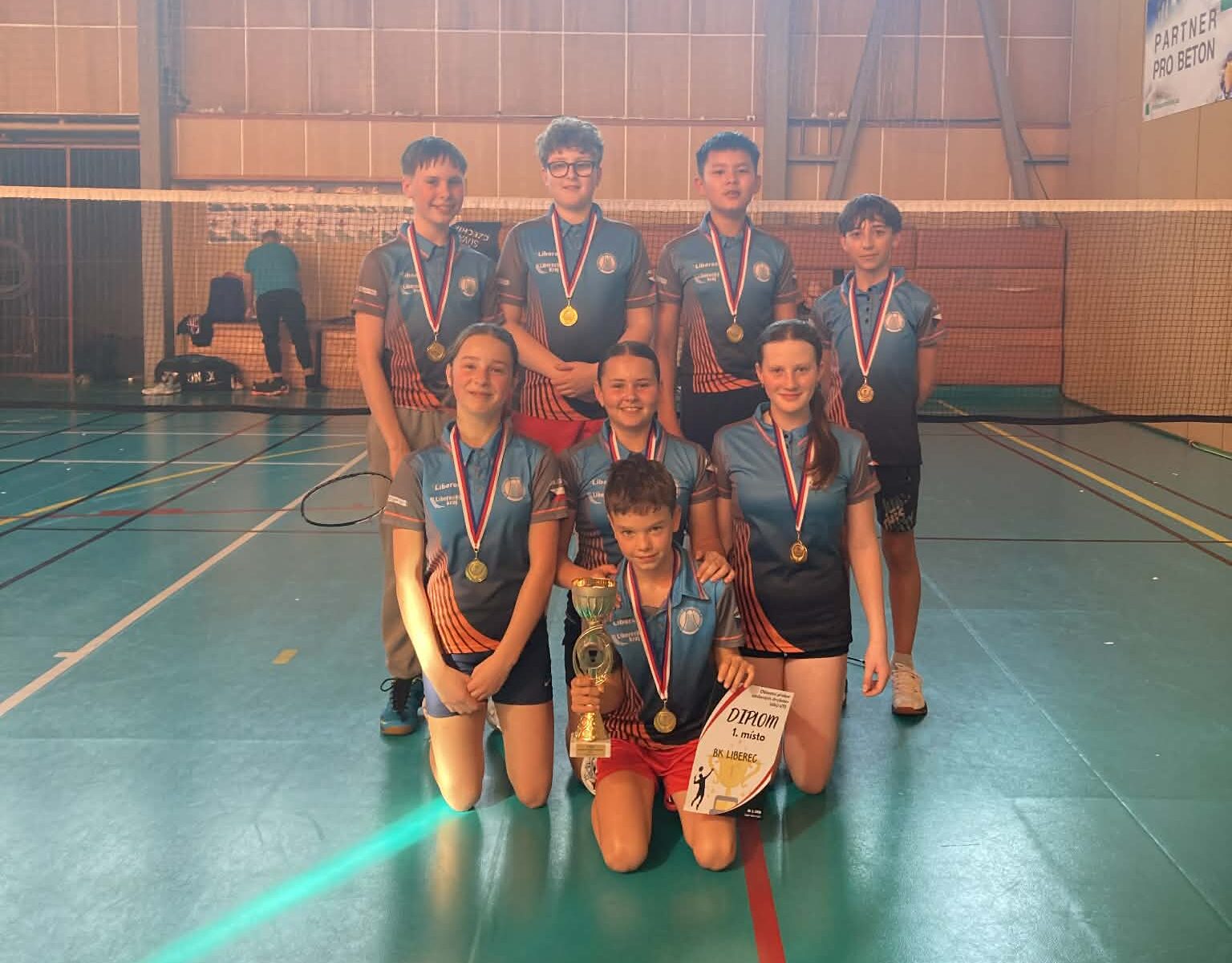 Na poslední chvíli do kalendáře na sobotu 28. března přibyla kvalifikace na letošní Mistrovství ČR družstev žáků U-15, kterou v Mostu uspořádal místní oddíl Super Stars a kromě domácího družstva jsme se zde o jedno místečko na republice utkali ještě s naším libereckým rivalem TJ Slovanem Vesec. Nám se povedlo dát dohromady početnou výpravu (děkujeme všem za improvizaci a změnu víkendových plánů) a na soupisce tak byli v následujícím pořadí uvedeni Luky Huy Le Gia, Mára Adolph, Luky Loskot, Luky Tomeš, Adámek Pechlát a v dívkách silné trio Linda Tokarová, Eliška Andršová a Háňa Stehlíková. Kompletní týmy se však tentokrát nepodařilo sestavit ani jednomu z našich soupeřů, kteří měli shodně po 2 chlapcích a 2 dívkách, takže jsme do každého utkání vstupovali s výhodou jednoho vyhraného zápasu. A to se nám hodilo a patřičně jsme toho využili, když se nám v prvním utkání povedlo zdolat Vesec poměrem 6:1, kde jediný bod soupeř urval v klučičí čtyřhře. Druhé utkání proti domácím Super Stars Most pak nabídlo drama od začátku až do konce, kdy se ze začátku skóre točilo jako káča, ale naši ho dokázali zvládnout a zvítězili 4:3, čímž v celkovém součtu triumfovali v oblastní kvalifikaci! Na krk si tak mohli pověsit zasloužené zlaté medaile a nad hlavu zvednout vítězný pohár! Nutno pochválit všechny naše zástupce za předvedené výkony, v párových disciplínách je stále ještě co dohánět, ale týmový duch byl tentokrát velmi silný a detaily se jistě ještě podaří dopilovat. Jediná naše výtka směřuje k nadměrnému používání elektronických zařízení během celého dne, které by určitě bylo možné omezit a soustředit se v danou chvíli jen na badminton a studium soupeřů. Skvělá práce, týme, jsme na vás pyšní!