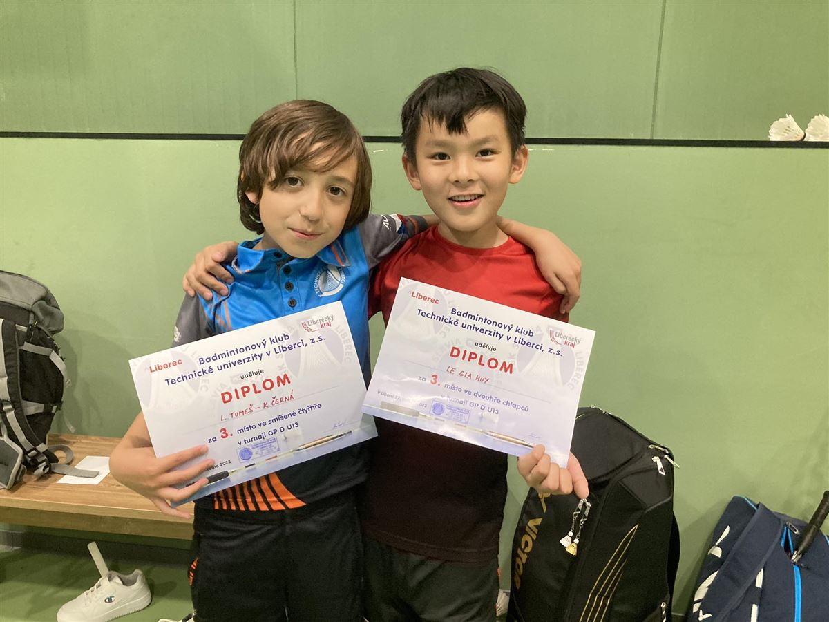 2) V domácí hale @Badminton u Muzea jsme pořádali GP D kategorie U-13 a tím, že naše děvčata vyrazila do Prahy, měli jsme zde pouze pánské obsazení v podobě tří Lukášů – Huy Le Gia, Loskota a Tomeše. V mixu si všichni zahráli s partnerkami z Benátek nad Jizerou a parádně se převedl hlavně Luky T., který si se svou partnerkou Kristýnou Černou vyšlápl i na první nasazený pár Jiří Holeček-Klára Martínková a bral po zásluze bronz. Ve dvouhře pak výborný výkon podal Luky HLG, který si na krk po zásluze pověsil taktéž bronzovou medaili. Za vyhrané první kolo dvouhry si též zaslouží velkou pochvalu Luky L.. A tak jedinou disciplínou, kde jsme cenný kov nezískali, byla čtyřhra, i když Lukášové HLG s T. s favorizovaným párem Kugler-Popela bojovali těsně na tři sety.